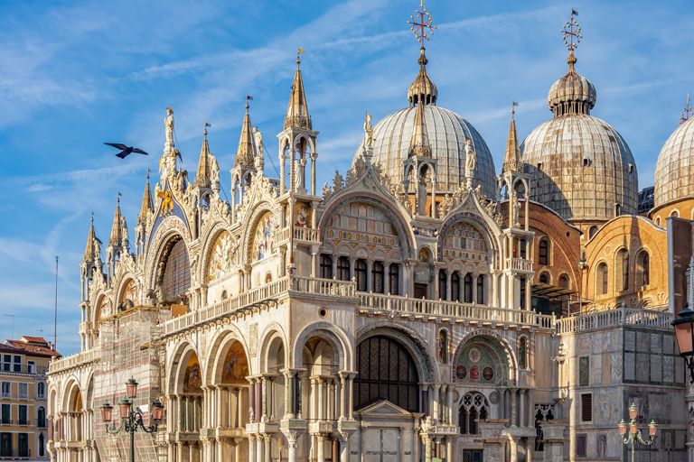 We reizen verder naar Venetië. Tijdens een wandeling dwars door het historisch centrum laten we ons meevoeren langs pleinen, steegjes en kanalen. Hoogtepunt is de Basiliek van San Marco, een architectonisch meesterwerk uit de elfde eeuw, gebouwd in Byzantijnse stijl. Binnen wacht een oogverblindend interieur: gouden mozaïeken uit de dertiende eeuw die het licht vangen en verhalen tot leven brengen. We nemen ruim de tijd om ook het Pala d’Oro te bewonderen, een schitterend altaarstuk, bezet met Byzantijnse panelen en edelstenen. We blijven twee nachten in Venetië, zodat er ruimte is om de stad ook op eigen tempo te verkennen.
